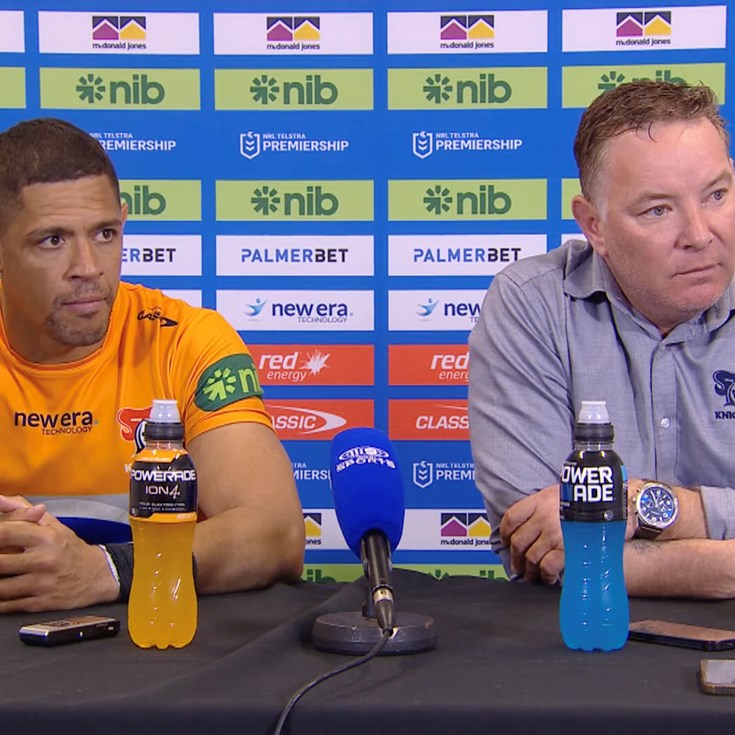 Mitchell Pearce send a charging Lachlan Fitzgibbon over for the first try of the game for the Knights