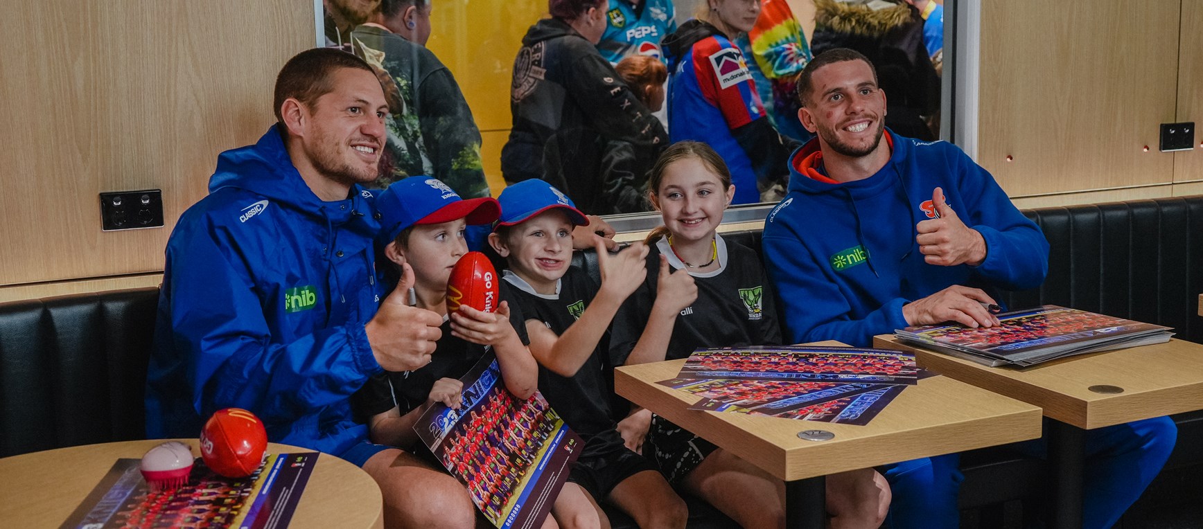 Our nib Newcastle Knights NRL players Kalyn Ponga and Adam Elliott visited a McDonald's Junior Clinic at Windale.
